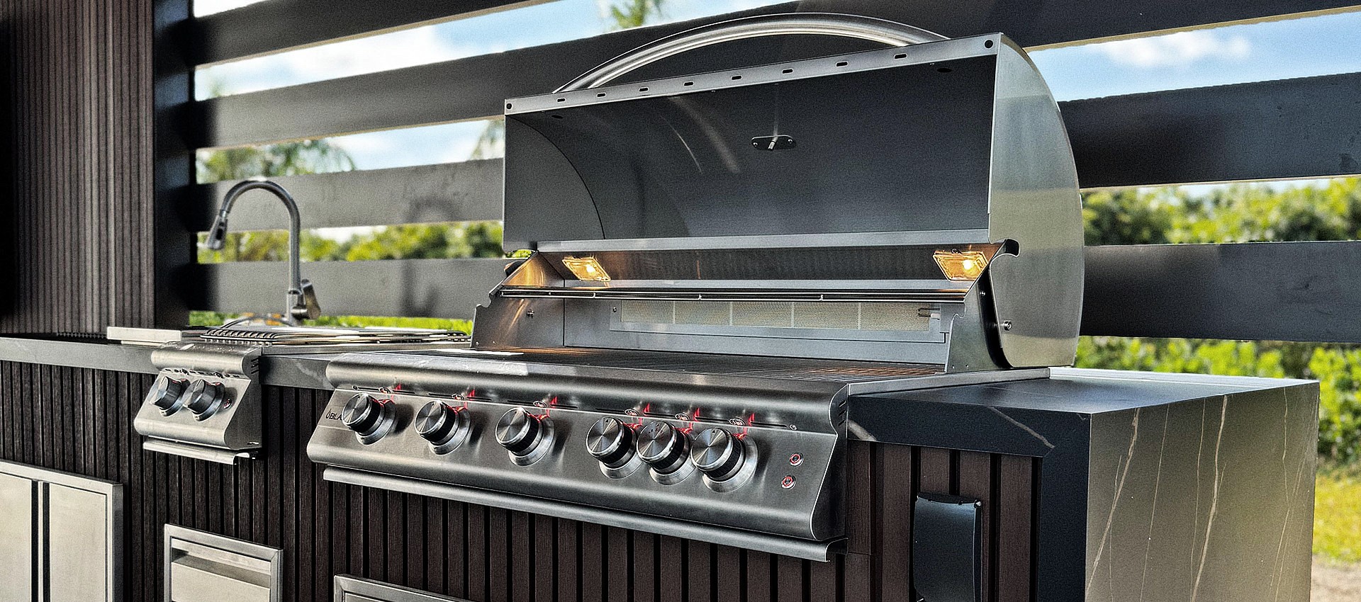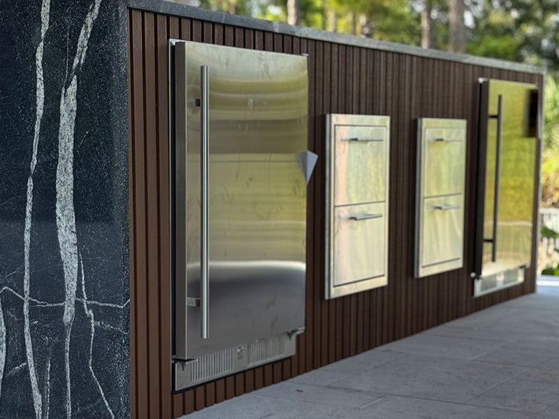 Fully equipped gourmet spaces with grills, bars, stone counters and appliances.